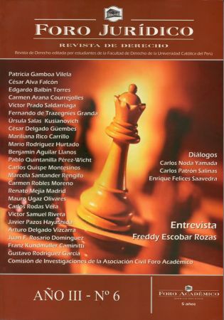 La Revista Foro Jurídico N° 6 siguiendo el carácter interdisciplinario que la caracteriza, abarca temas de las ramas del Derecho Laboral, Derecho Sucesorio, Derecho Procesal, Derecho Penal, Derecho Internacional, Derecho Aduanero y Comercial, Derecho de la Competencia, entre otros . Para mayor conocimiento y lectura de los temas y artículos tratados
